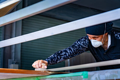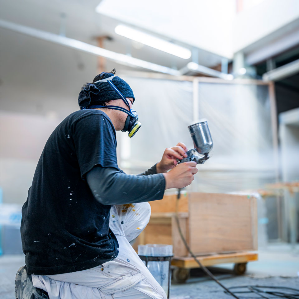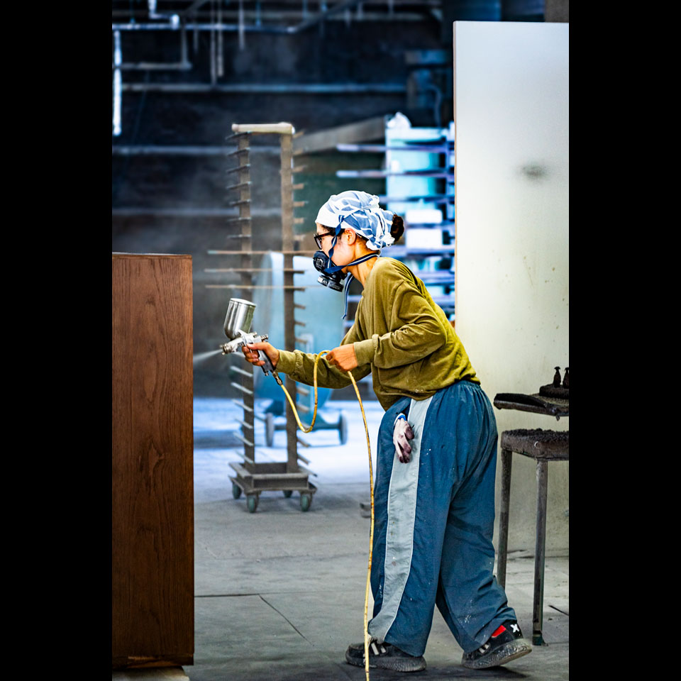 木製の家具や建具に塗装を施すことで、その見た目や耐久性を高め、街でみかける製品(本棚やテーブル等)へと仕上げています。