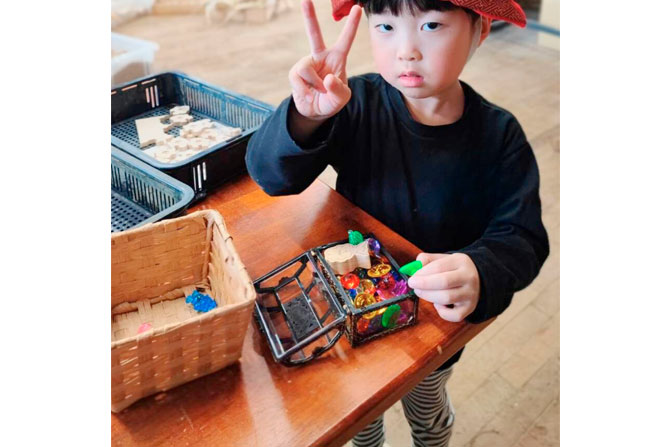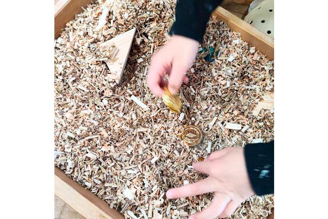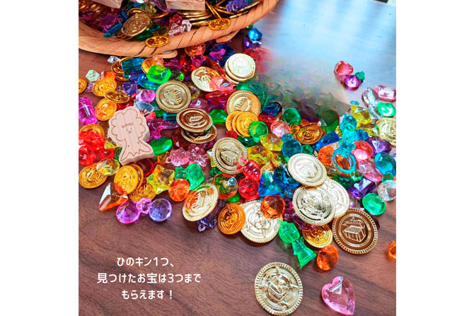 木くずBOXの中にあるキラキラの宝石やコイン、KOUGIキャラクター「ひのキン」を探してね!