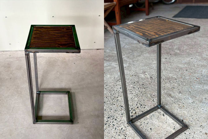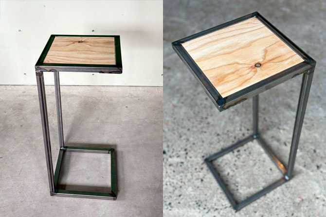 鉄材を溶接でくっつけてサイドテーブルのフレーム作り→鉄フレームに木の天板をネジ止め→ソファやベッドサイドにちょうどいいサイドテーブルが完成!